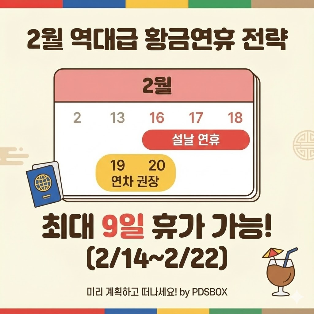 | 2월 | 2월 16일~18일 | 설날 연휴 | 월, 화, 수 (목, 금 연차 시 최대 9일 연휴) |