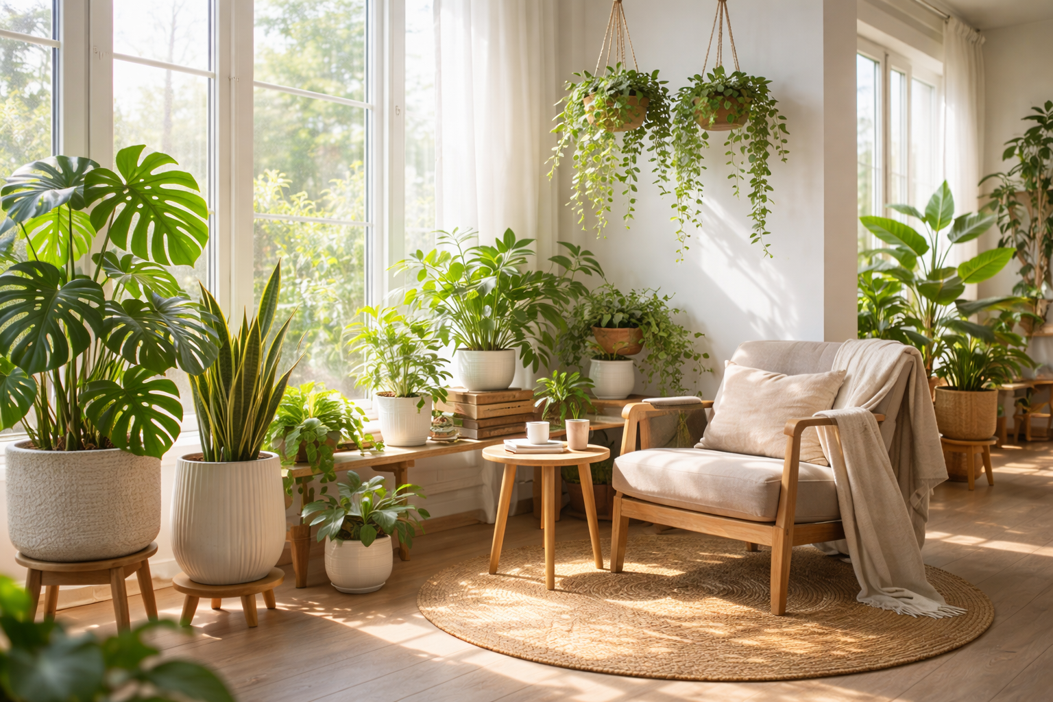 식물을 배치할 때는 높낮이를 다르게 하면 공간이 훨씬 입체적으로 보입니다. 커다란 대형 화분은 거실 구석의 비어있는 공간에 배치해 무게중심을 잡고, 작은 화분들은 선반이나 스툴 위에 옹기종기 모아두면 리듬감이 생깁니다. 행잉 플랜트를 활용해 천장에 매달아 두면 좁은 집도 훨씬 넓어 보이고 숲속에 있는 듯한 느낌을 줍니다. 초록빛 식물들이 뿜어내는 맑은 공기와 에너지는 여러분의 집을 세상에서 가장 편안한 안식처로 만들어줄 것입니다.